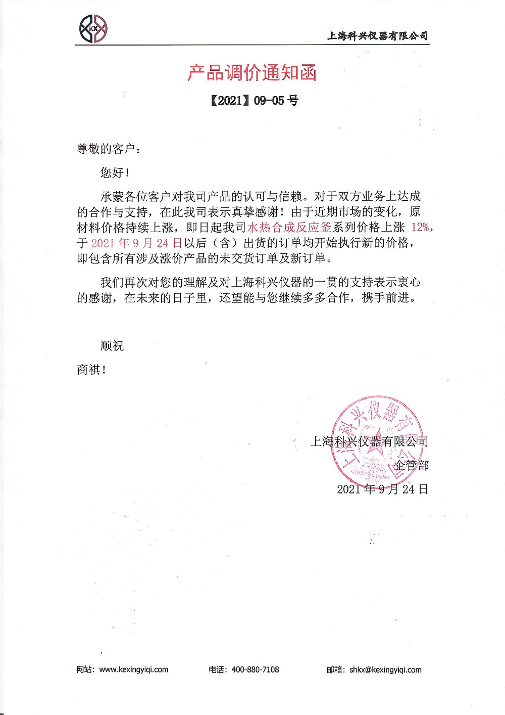 承蒙各位客戶對我司產(chǎn)品的認可與信賴。對于雙方業(yè)務(wù)上達成的合作與支持,在此我司表示真摯感謝!由于近期市場的變化,原材料價格持續(xù)上漲,即日起我司水熱合成反應(yīng)釜系列價格上漲 12%,于 2021 年 9 月 24 日以后(含)出貨的訂單均開始執(zhí)行新的價格,既包含所有涉及漲價產(chǎn)品的未交貨訂單及新訂單。
